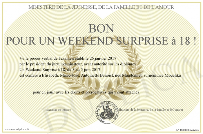 Envoyez par email votre Bon pour un weekend surprise à 18 ! personalisé