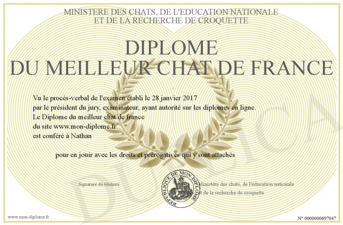 Envoyez par email votre Diplôme du meilleur chat de france personalisé