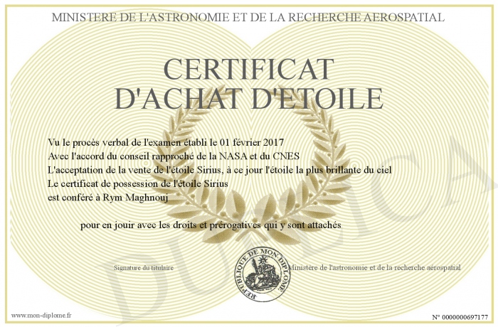 Envoyez par email votre Certificat d'achat d'étoile personalisé