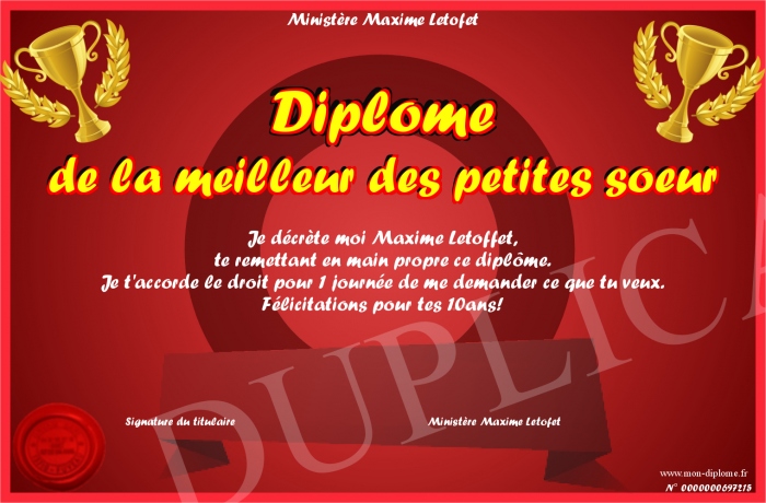 Envoyez par email votre Diplôme de la meilleur des petites soeur personalisé