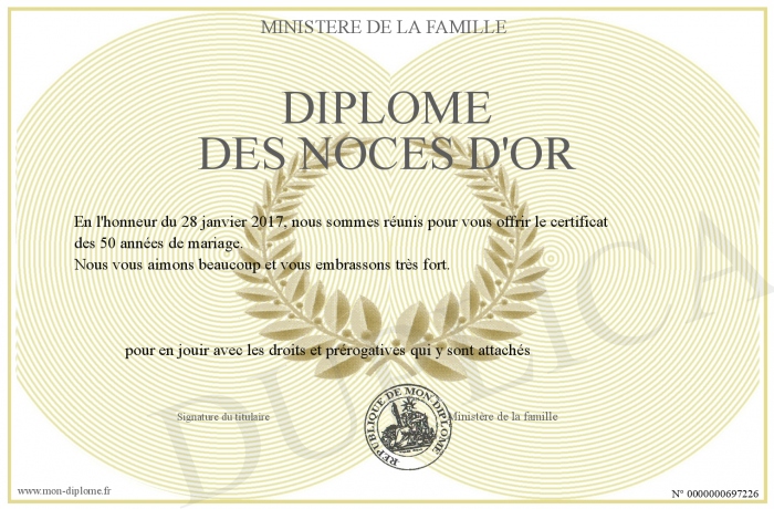 Envoyez par email votre Diplôme des Noces d'Or personalisé
