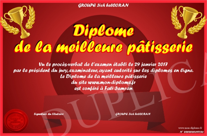 Envoyez par email votre Diplôme de la meilleure pâtisserie personalisé