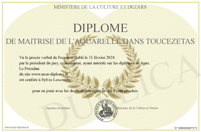 Envoyez par email votre Diplôme de Maîtrise de l'Aquarelle dans Toucézétas personalisé