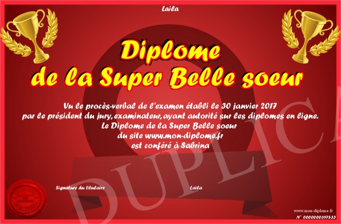Envoyez par email votre Diplome de la Super Belle soeur personalisé