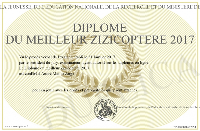 Envoyez par email votre Diplôme du meilleur Zizicoptère 2017 personalisé