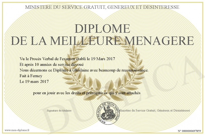 Envoyez par email votre Diplôme de la Meilleure Ménagère personalisé