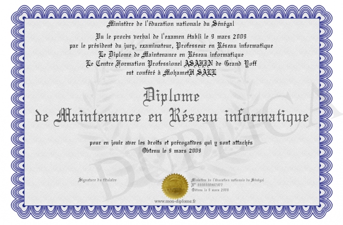 Envoyez par email votre Diplome de Maintenance en Réseau informatique personalisé