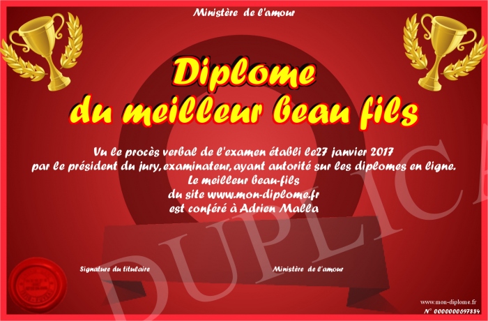 Envoyez par email votre Diplome du meilleur beau fils personalisé