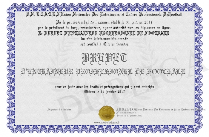 Envoyez par email votre BREVET D'ENTRAINEUR PROFFESIONEL DE FOOTBALL personalisé