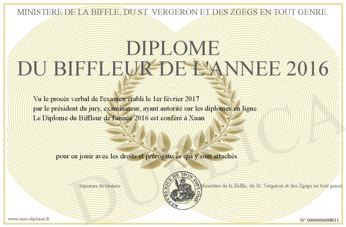Envoyez par email votre Diplôme du Biffleur de l'année 2016 personalisé