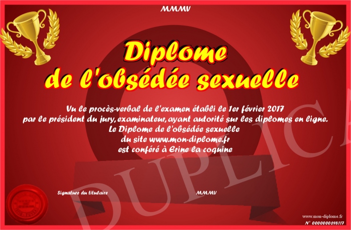 Envoyez par email votre Diplôme de l'obsédée sexuelle personalisé
