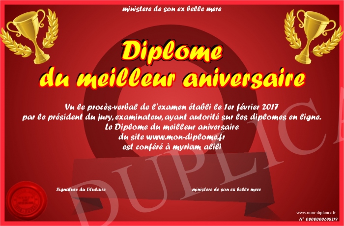 Envoyez par email votre Diplôme du meilleur aniversaire personalisé