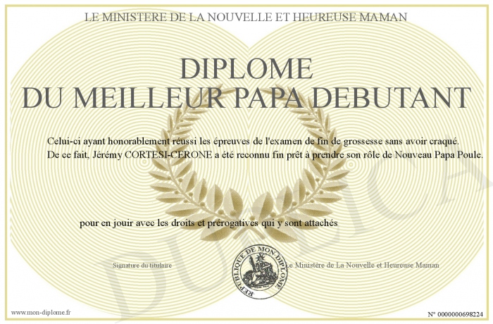 Envoyez par email votre Diplôme du Meilleur Papa Débutant personalisé