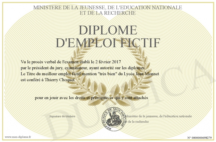 Envoyez par email votre Diplôme d'emploi fictif personalisé