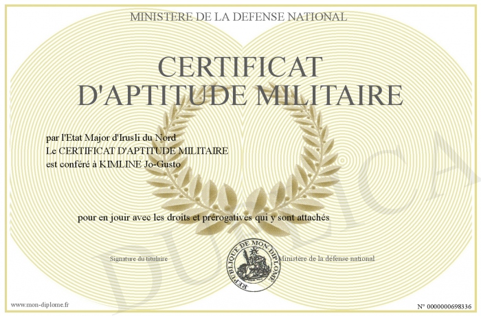 Envoyez par email votre CERTIFICAT D'APTITUDE MILITAIRE personalisé