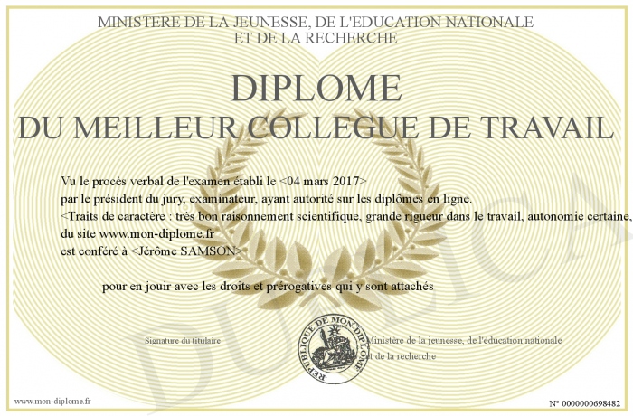 Envoyez par email votre Diplôme du meilleur collègue de travail personalisé