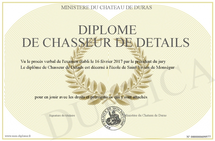 Envoyez par email votre Diplôme de Chasseur de détails personalisé