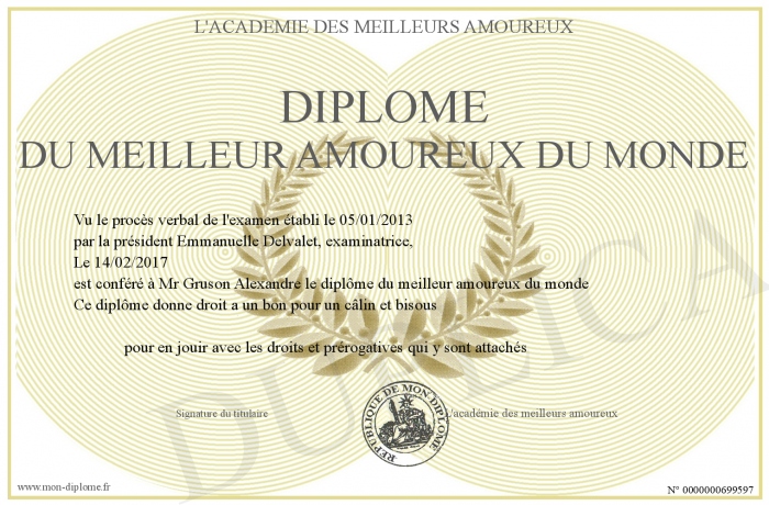 Envoyez par email votre Diplôme du meilleur amoureux du monde personalisé
