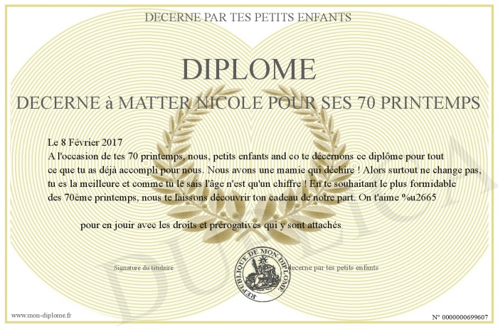 Envoyez par email votre DIPLOME decerne à matter Nicole pour ses 70 printemps personalisé