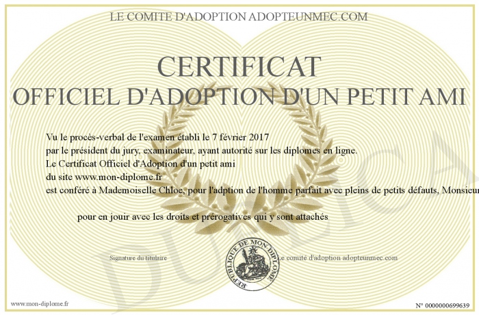 Envoyez par email votre Certificat Officiel d'Adoption d'un petit ami personalisé