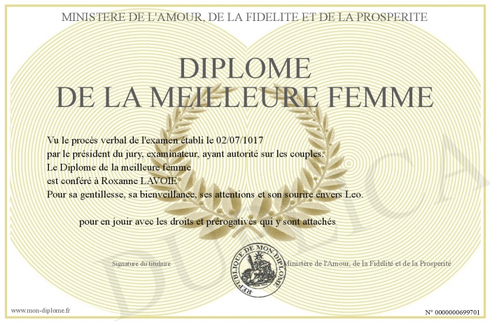 Envoyez par email votre Diplome de la meilleure femme personalisé