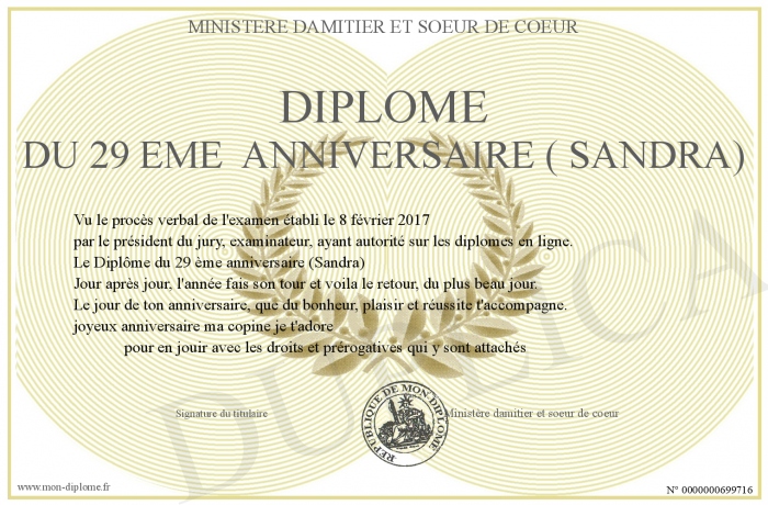 Envoyez par email votre Diplôme du 29 ème anniversaire ( sandra) personalisé