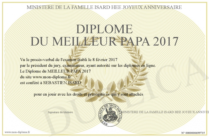 Envoyez par email votre Diplôme du MEILLEUR PAPA 2017 personalisé