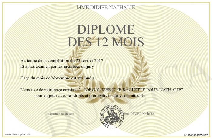 Envoyez par email votre Diplôme des 12 mois personalisé