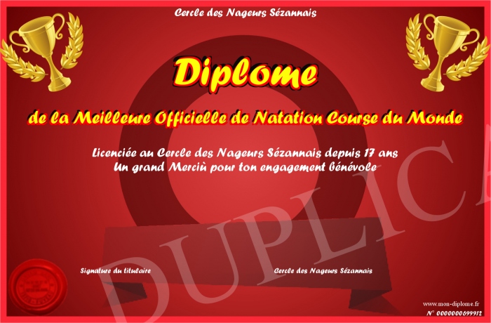 Envoyez par email votre Diplôme de la Meilleure Officielle de Natation Course du Monde personalisé