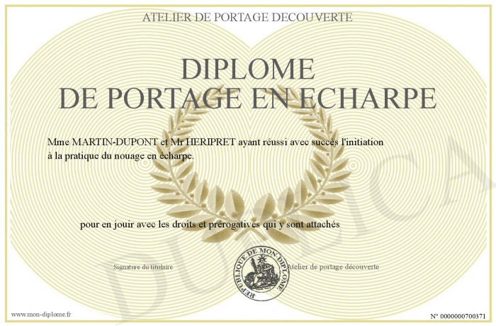 Envoyez par email votre Diplôme de portage en écharpe personalisé