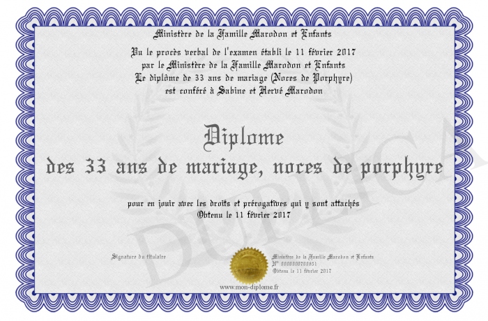 Envoyez par email votre Diplôme des 33 ans de mariage, noces de porphyre personalisé