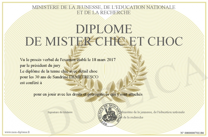 Envoyez par email votre Diplôme dE MISTER chic et choc personalisé