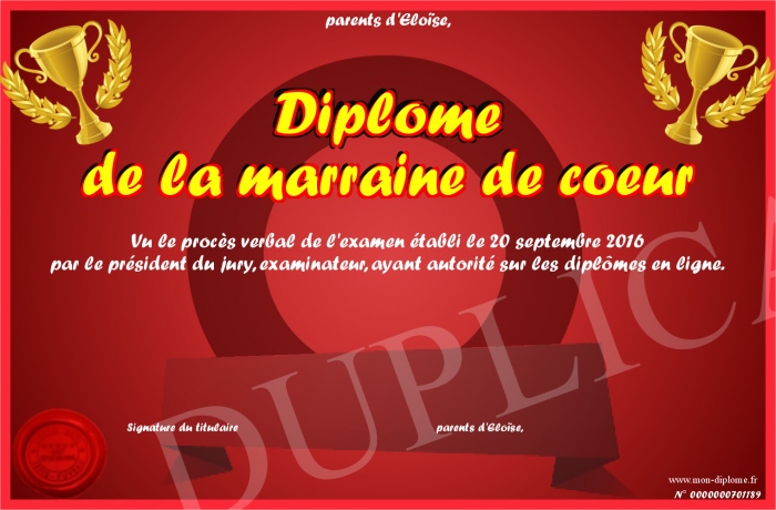 Envoyez par email votre Diplôme de la marraine de coeur personalisé