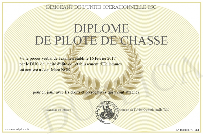 Envoyez par email votre Diplôme de pilote de chasse personalisé