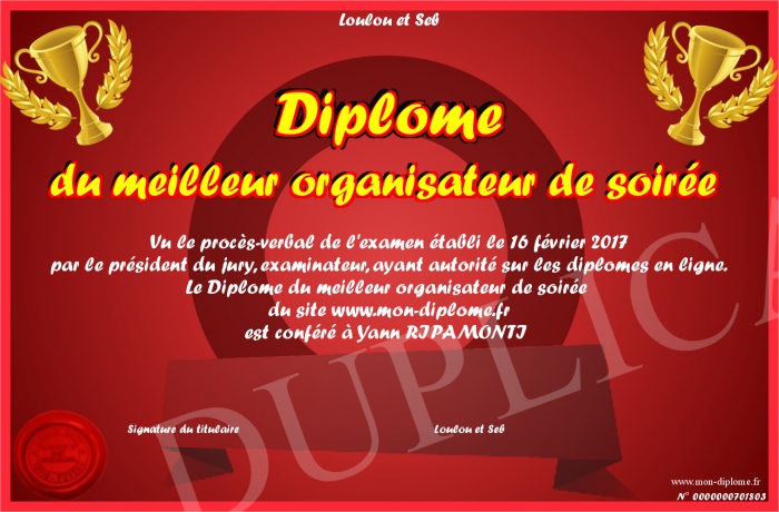 Envoyez par email votre Diplôme du meilleur organisateur de soirée personalisé