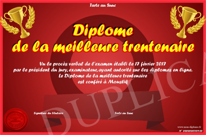 Envoyez par email votre Diplôme de la meilleure trentenaire personalisé
