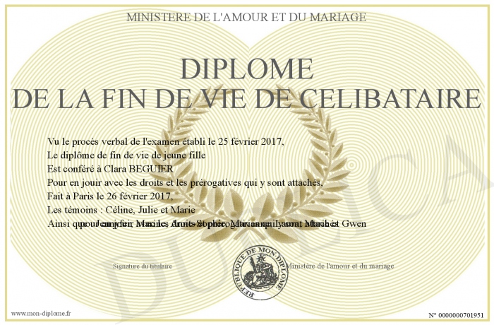 Envoyez par email votre Diplôme de la fin de vie de célibataire personalisé