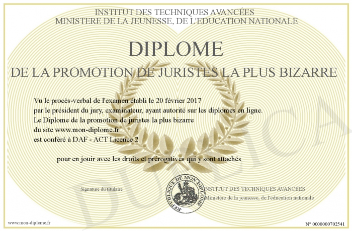 Envoyez par email votre Diplôme de la promotion de juristes la plus bizarre personalisé