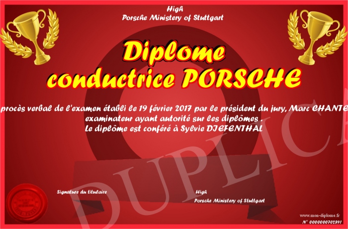 Envoyez par email votre Diplôme conductrice PORSCHE personalisé