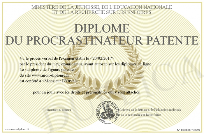 Envoyez par email votre Diplôme du procrastinateur patenté personalisé