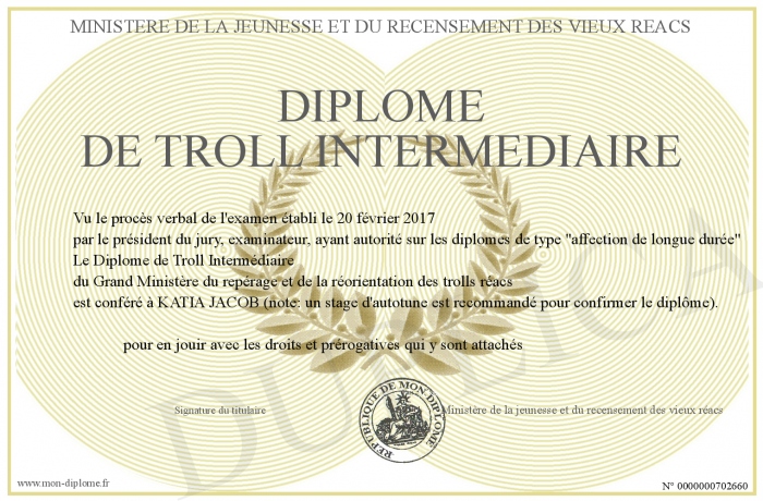 Envoyez par email votre Diplôme de Troll Intermédiaire personalisé
