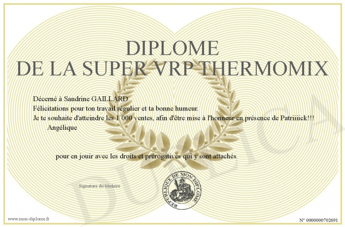 Envoyez par email votre Diplôme de la super VRP Thermomix personalisé