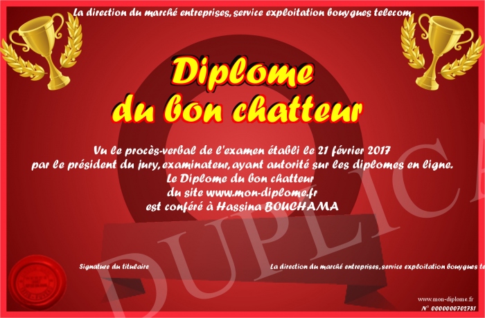 Envoyez par email votre Diplôme du bon chatteur personalisé
