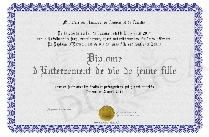 Envoyez par email votre Diplôme d'Enterrement de vie de jeune fille personalisé