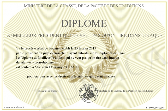Envoyez par email votre Diplôme du Meilleur Président qui ne veut pas qu'on tire dans ltraque personalisé