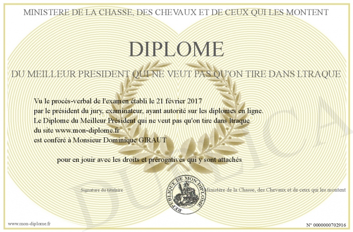 Envoyez par email votre Diplome du Meilleur Président qui ne veut pas qu'on tire dans ltraque personalisé