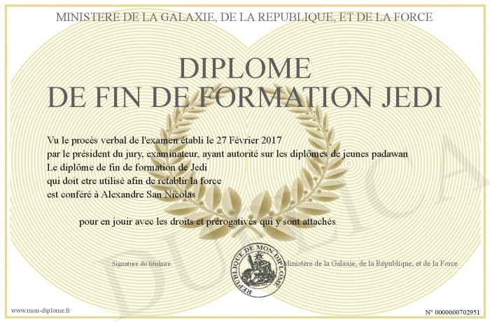 Envoyez par email votre Diplôme de fin de formation JEDI personalisé