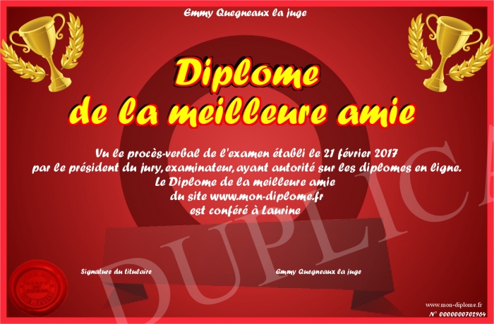 Envoyez par email votre Diplôme de la meilleure amie personalisé