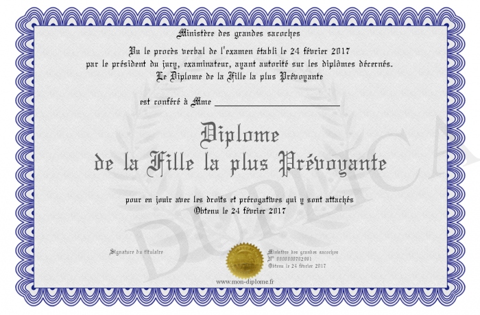 Envoyez par email votre Diplôme de la Fille la plus Prévoyante personalisé