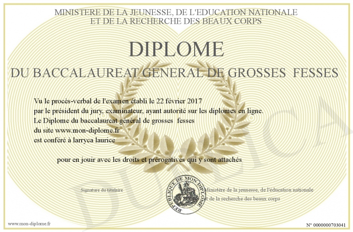 Envoyez par email votre Diplôme du baccalaureat général de grosses fesses personalisé